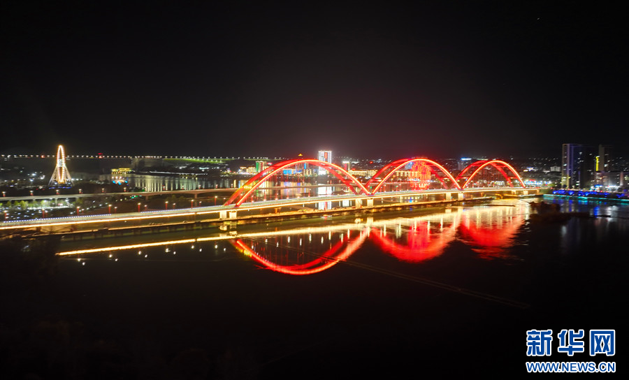 夜幕降临,丹江口水都二桥霓虹闪烁,高耸的三跨拱架宛如几道“彩虹”横卧江面。