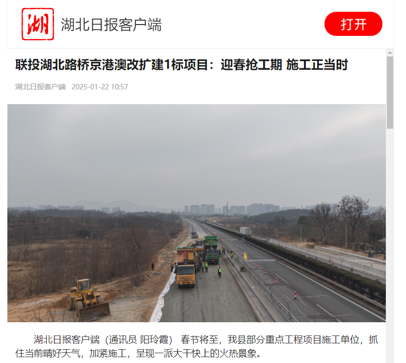 媒体聚焦 | 联投湖北路桥京港澳改扩建1标项目:迎春抢工期,施工正当时
