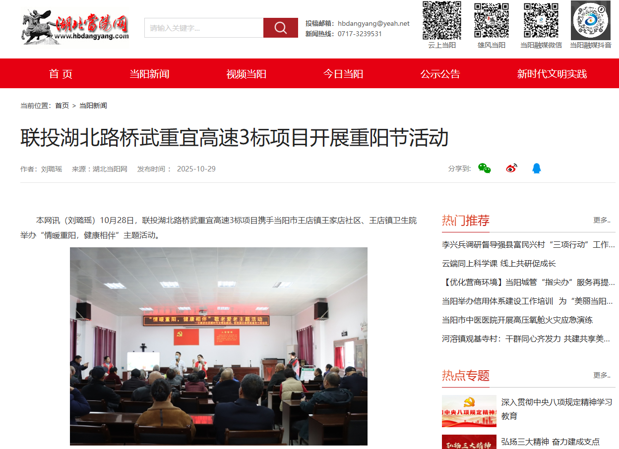 正值重阳节,联投湖北路桥武重宜高速3标项目携手当阳市王店镇王家店社区、王店镇卫生院举办“情暖重阳,健康相伴”主题活动,湖北当阳网对活动进行报道,以下是报道全文: