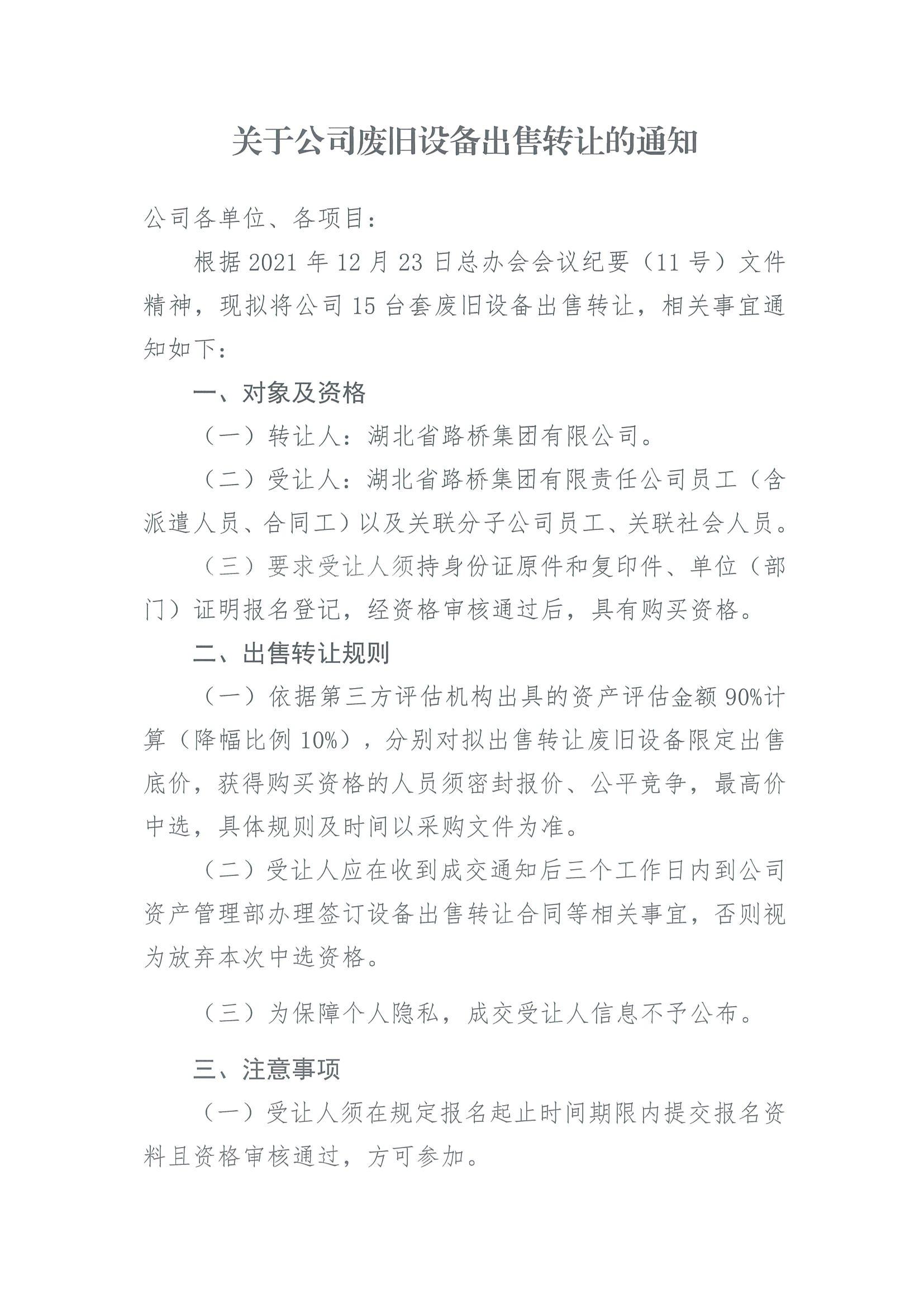 关于公司废旧设备出售转让的通知